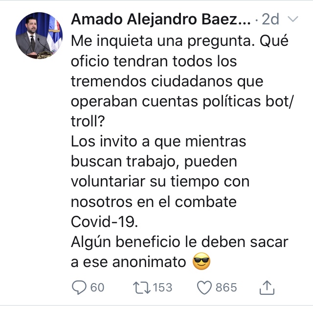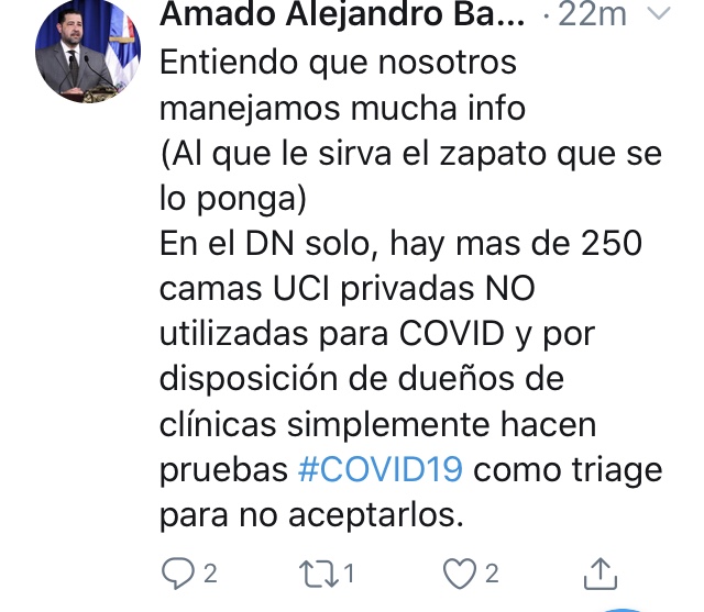 Este martes también sacó espacio para cuestionar la actitud de las clínicas privadas frente a los pacientes de COVID-19: “Entiendo que nosotros manejamos mucha info (al que le sirva el zapato que se lo ponga). En el DN solo, hay más de 250 camas UCI privadas NO utilizadas para COVID y por disposición de dueños de clínicas simplemente hacen pruebas #COVID19 como triage para no aceptarlos”, escribió.
