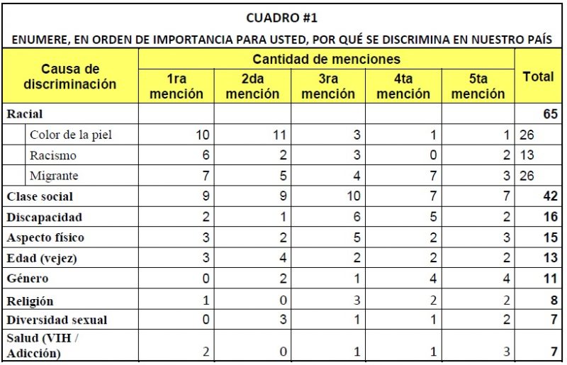 En esta clasificación se incluyó “por el color de la piel”: 10 en primera mención, 11 en segunda mención, 3 en tercera mención, 1 en cuarta mención y 1 en quinta mención; “por racismo”: 6 en primera mención, 2 en segunda mención, 3 en tercera mención y 2 en quinta mención; “por ser migrante-ser haitiano-lugar donde nace”: 7 en primera mención, 5 en segunda mención, 4 en tercera mención, 7 en cuarta mención y 3 en quinta mención.