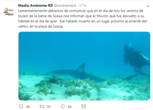 El Ministerio de Medio Ambiente informó a través de su cuenta de Twitter: “Lamentablemente debemos de comunicar que en el día de hoy los centros de buceo de la bahía de Sosúa nos informan que el tiburón que fue devuelto a su hábitat en el día de ayer,  fue hallado muerto en un lugar próximo al arrecife del cañón, en la playa de Sosúa”. “Valoramos el esfuerzo realizado por los técnicos locales, voluntarios de la Fundación Ecológica Maguá y voluntarios de centros de buceo que procuraron preservar la vida del animal marino”, añade. Un especialista local del Viceministerio de Recursos Costeros y Marinos asistió en el rescate del tiburón en Sosúa para ser devuelto a su hábitat.