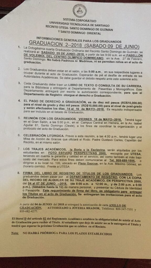 “El pago de derecho a graduación es de diez mil pesos (RD$10,000) para el nivel de grado y diez mil pesos (RD$10,000) para el nivel de post-grado y serán efectuados los días 14 al 16 de mayo-2018. Es requisito indispensable para ser incluido en el listado Graduación”, indica un documento en el que la universidad da informaciones generales sobre la “graduación 2-2018” a realizarse el sábado 9 de junio en el Pabellón de Voleibol del Centro Olímpico, en el Distrito Nacional.